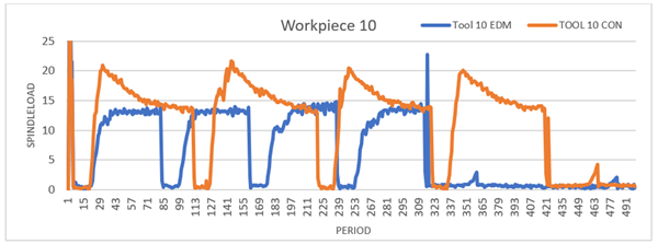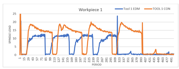 With the conventionally dressed grinding wheel, the spindle load already exceeds the set limit on initial contact and the feed rate is reduced. The EDM dressed grinding wheel increases slowly and reaches the set limit without significant load peaks. The EDM dress wheel requires a shorter grinding time for the four grooves than the conventionally dressed wheel.
