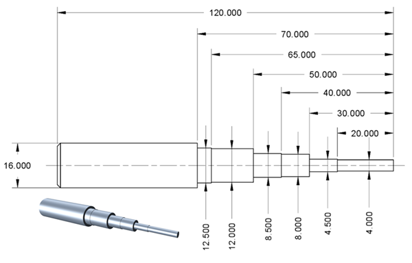 Figure 5: Workpiece, carbide, Ø16mm, with several steps for cylindrical grinding, CIM3D, ToolDraft