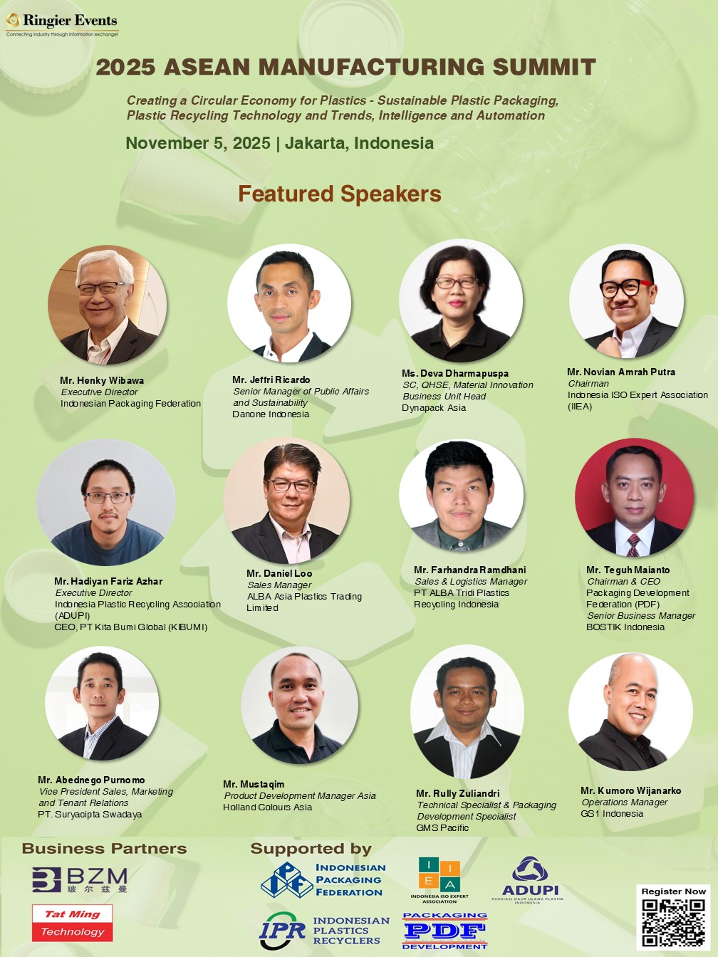 This year, the Summit has the active support of the most influential industry associations – the Indonesian Packaging Federation (IPF), Indonesian Plastics Recyclers (IPF), Indonesia ISO Expert Association (IIEA), Indonesian Plastic Recycling Association (ADUPI) and Packaging Development Federation (PDF). Business Partners for this conference are Boltzmann (Guangzhou) Technology Co., Ltd., which specializes in cutting-edge online thickness measurement solutions for industries such as manufacturing and quality control; and Tat Ming Technology Co., Ltd., a leading company in the injection molding industry offering customized solutions. The conference also has the special participation of Suryacipta, City of Industry.