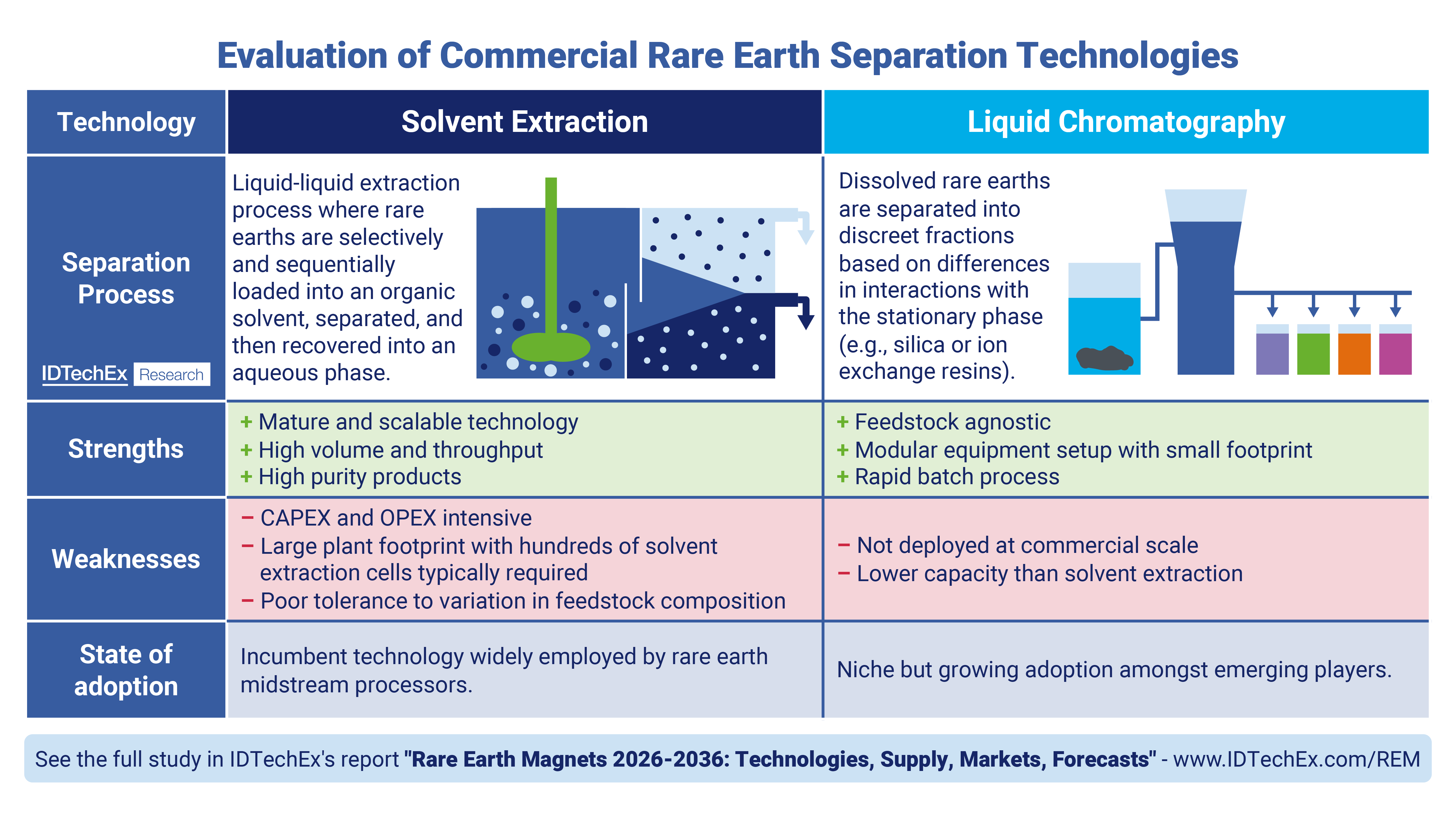 Market leaders and emerging players are gravitating towards solvent extraction as the industry standard high-capacity rare earth separation technology, despite high CapEx and OpEx requirements. Solvent extraction uses chemical additives to selectively and sequentially extract rare earths into organic solvents, followed by separation and recovery back into an aqueous phase. Solvent extraction is widely employed in the mineral processing industry, offering high volume and high throughput rare earth separation suitable for primary and secondary feedstocks. While solvent extraction technology is capital and energy intensive, with high associated operational costs, it remains the mature separation technology to produce rare earth magnet precursors.