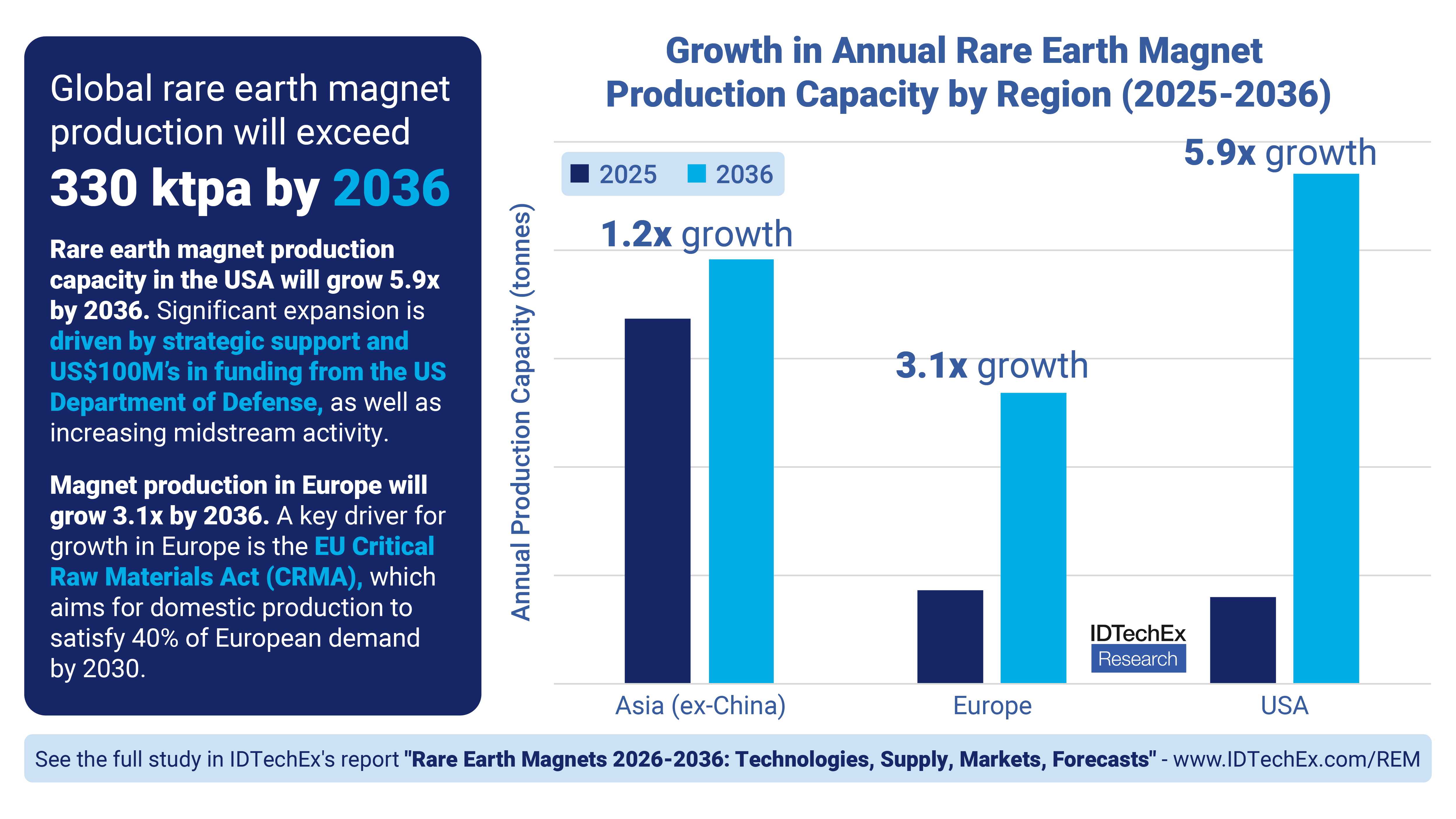 IDTechEx finds global rare earth magnet production will exceed 330 ktpa by 2036 as USA and Europe emerge as key growth regions