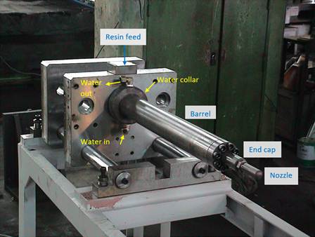 In an IMM, the barrel has a water collar (see Fig. 3); the oil tank has an oil cooler. The mold can be considered as a heat exchanger. Water is used to cool down the barrel, the hydraulic oil and the mold respectively. The heat removed is given by the expression water flow rate * specific heat of water * temperature difference of the outlet and inlet. Flow meters and differential thermocouples are used to do measurements to determine the heat removed.