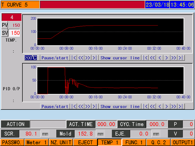 The controller itself has auto-tuning algorithms for setting the PID parameters automatically. Fig. 4 shows an auto-tuned graph for zone 4 rising from 50°C to the 150°C set temperature. About 12 minutes was used. The operator can improve upon it by adjusting the parameters. In the process, the effects of the value of P, I and D are learned.