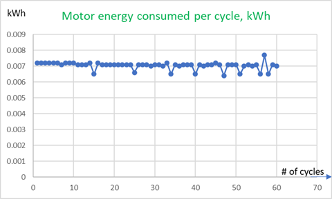 Using the optional digital power meter, the power consumption of the motor and its power factor could be recorded for each cycle. The former is plotted in Fig. 7. By measuring the phase currents, the efficiency of the motor could be calculated. It was found that efficiency and power factor are low at low loads.