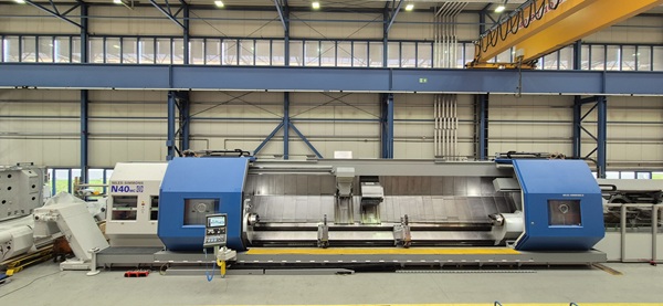 This is CNC turning and milling machining at the highest level: With the N40 MC machining centre from NILES-SIMMONS, users can manufacture rotationally symmetrical components up to nine meters in length, with a swing diameter of up to 1,100 mm and a weight of up to four tons in a single clamping and, if required, as a closed door machining process. Various operations such as turning, milling, grinding, and measuring are integrated, all with high precision. The 60° slant bed technology of the steel welded frame with concrete filling makes a significant contribution to machining accuracy.