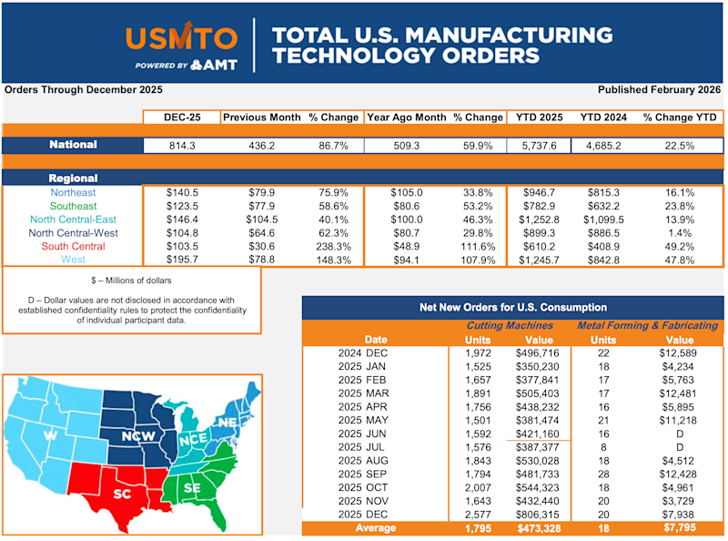 New orders of metalworking machinery, measured by the U.S. Manufacturing Technology Orders Report published by AMT – The Association For Manufacturing Technology, totaled $814.3 million in December 2025, the highest monthly order value on record. The value of December 2025 orders grew 86.7% over November 2025 and 59.9% over December 2024. Through November 2025, the annual total had already surpassed the value of all 2024 orders by 5.1%. December orders brought the 2025 total value of machinery orders to $5.74 billion, beating 2024 by 22.5%.