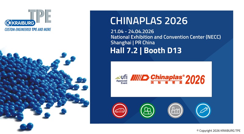KRAIBURG TPE, a global manufacturer of thermoplastic elastomer (TPE) compounds, will present its new TPE material portfolio of application-ready compounds for automotive, consumer, electronics, and medical uses at CHINAPLAS 2026, which will take place from April 21–24 at the National Exhibition and Convention Center in Shanghai, PR China Visitors can find KRAIBURG TPE at Hall 7.2, Booth D13.