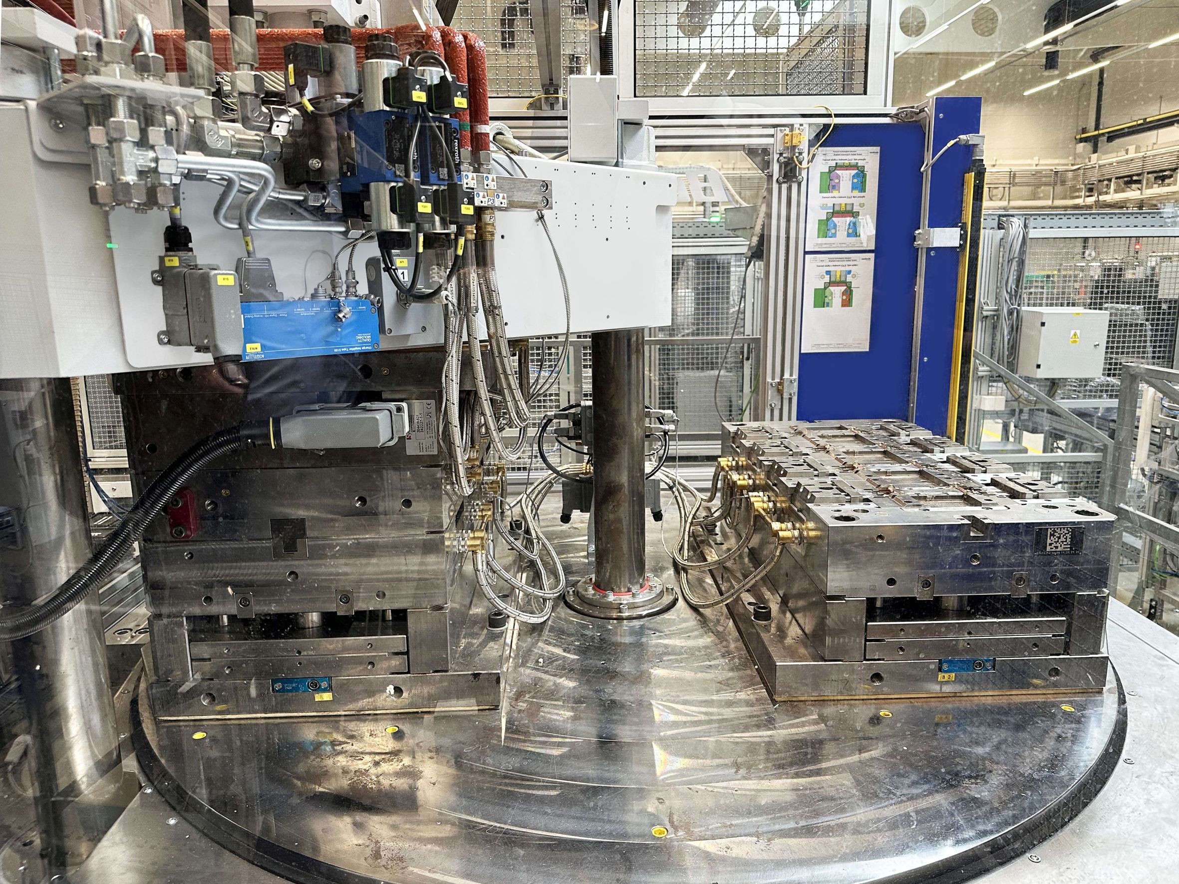 In the course of developing the new production process, the automation concept was com pletely redesigned. However, some tried and tested features were left unchanged, such as leaving a large WITTMANN vertical injection molding machine with 270 tons clamping force standing at the center of the production cell, equipped with a two-station rotary table, plus temperature controllers also supplied by WITTMANN.
