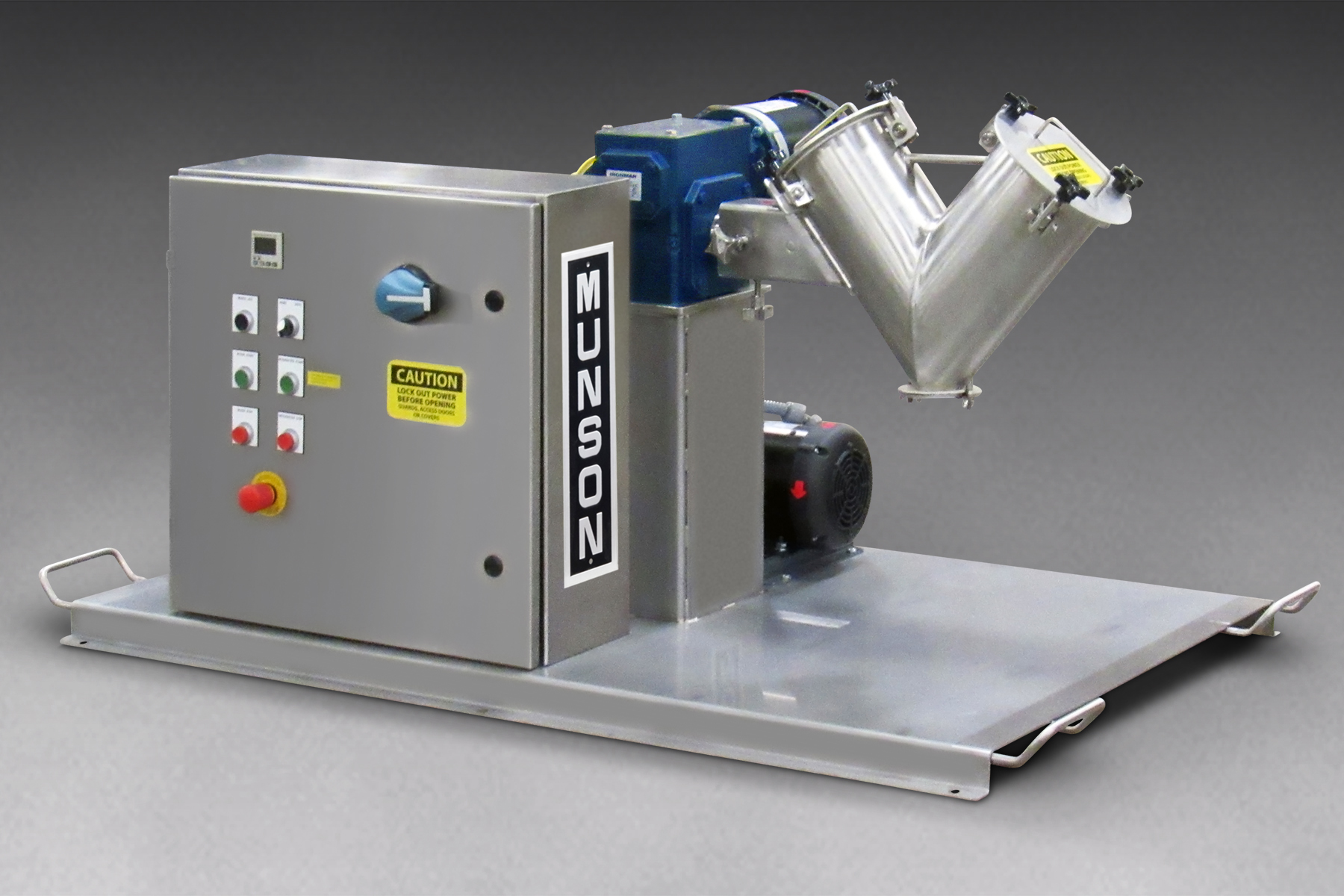 The VCB Series cantilevered mounting system from Munson Machinery supports interchangeable vee cone vessels in six sizes from 0.24 to 15.14 liter for laboratory and small batch applications. It has two inclined cylinders that cause bulk materials to fall, converge and divide with each end-over-end rotation, achieving uniform blends in 5 to 15 minutes typical, with less product degradation than in agitated machines.
