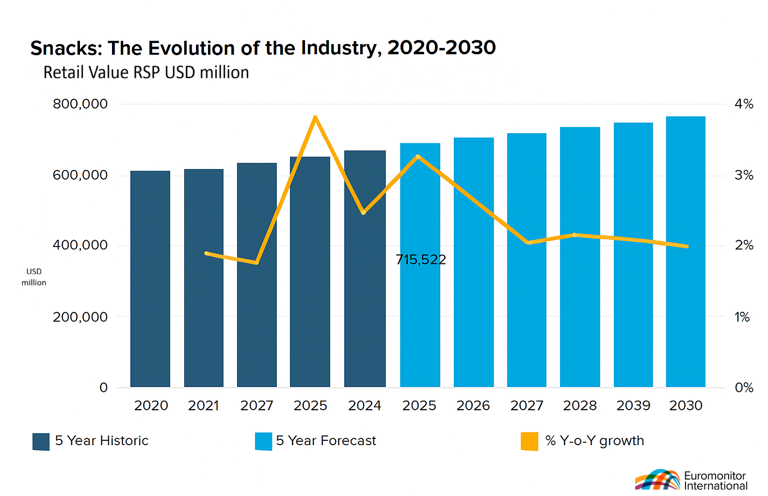 Euromonitor International’s World Market of Snacks Report 2025 highlights the industry-wide efforts and projects that the category’s five-year forecast outlook (2025–2030) will outpace its historic performance (2019–2024), as the sector moves beyond pandemic-related strains and intensifies its focus on value-driven upgrades.
