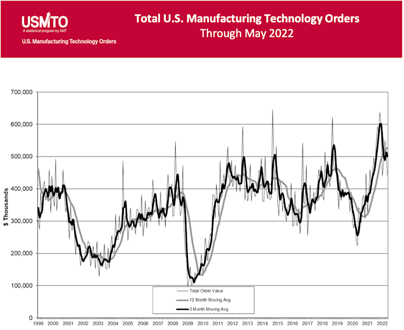 Orders of manufacturing technology dipped slightly in May 2022 to $441.2 million, according to the latest U.S. Manufacturing Technology Orders Report published by AMT – The Association For Manufacturing Technology. May orders were down 14% from April 2022 but nearly equal to May 2021 orders with a modest 1% decline. Year-to-date orders reached $2.42 billion, a 20% increase over 2021 orders through May.