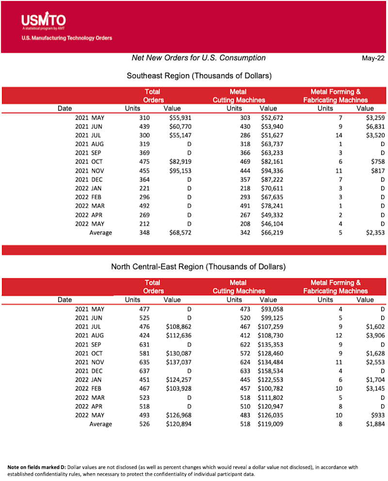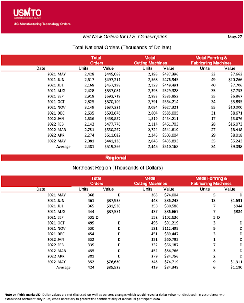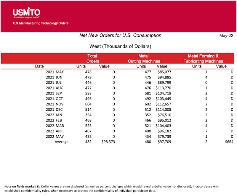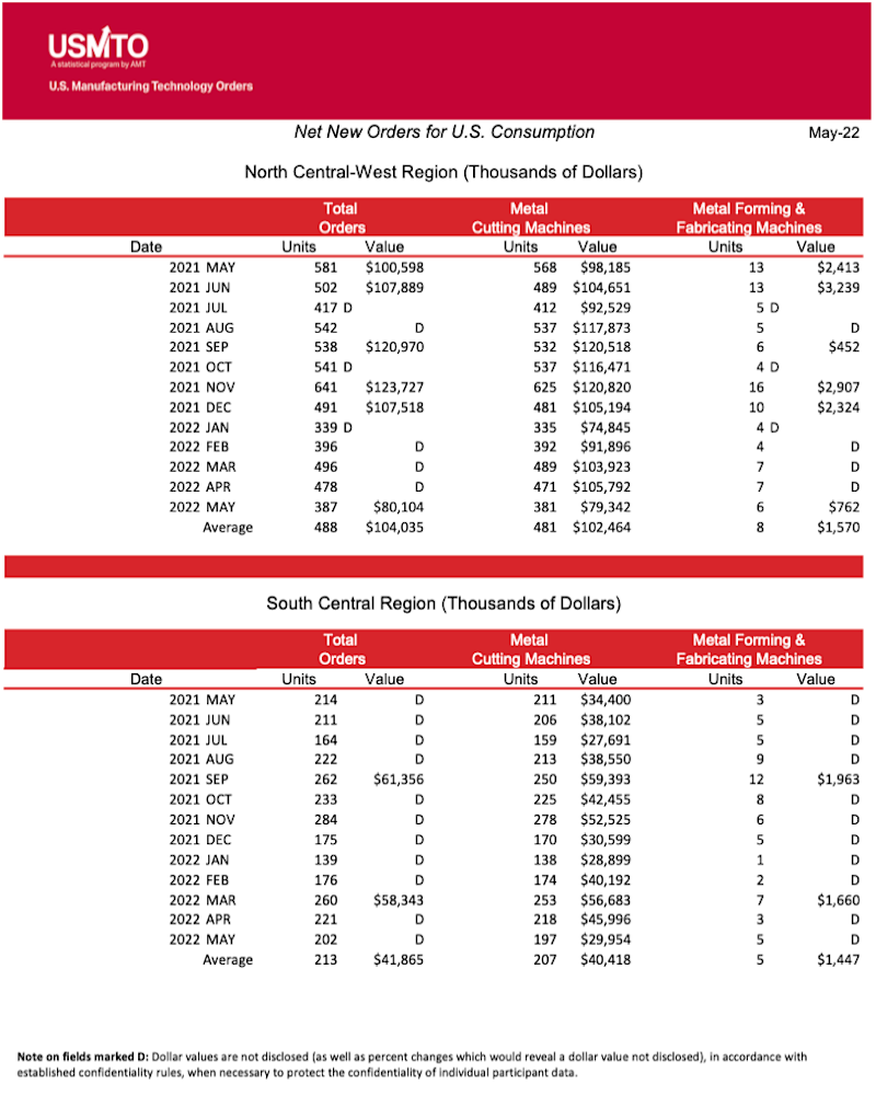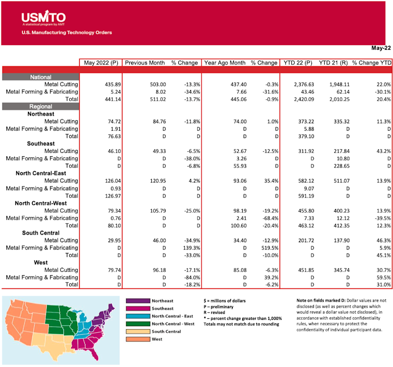 The United States Manufacturing Technology Orders (USMTO) Report is based on the totals of actual data reported by companies participating in the USMTO program. This report, compiled by AMT – The Association For Manufacturing Technology, provides regional and national U.S. orders data of domestic and imported machine tools and related equipment. Analysis of manufacturing technology orders provides a reliable leading economic indicator as manufacturing industries invest in capital metalworking equipment to increase capacity and improve productivity.