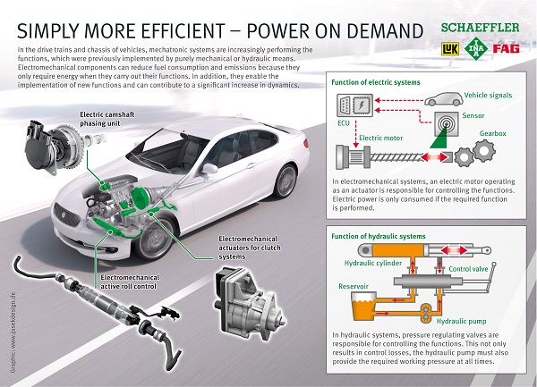 Mechatronic “power-on-demand” solutions use less energy compared to classical hydraulic systems. "Electromechanical systems only use power when they need it," explains Uwe Wagner, Automotive Research and Development Manager at Schaeffler. "Using power only when it is needed leads to a noticeable reduction in fuel consumption." By using mechatronic actuators in double clutch transmissions for example, it should be possible to make up to 90 per cent energy savings compared to a hydraulically operated control system. The "power on demand" principle works differently to hydraulic solutions which have a pressure control valve to control functionality. Not only are there losses to the control function but the hydraulic pump also has to provide the required operating pressure at all times which represents a permanent energy drain.