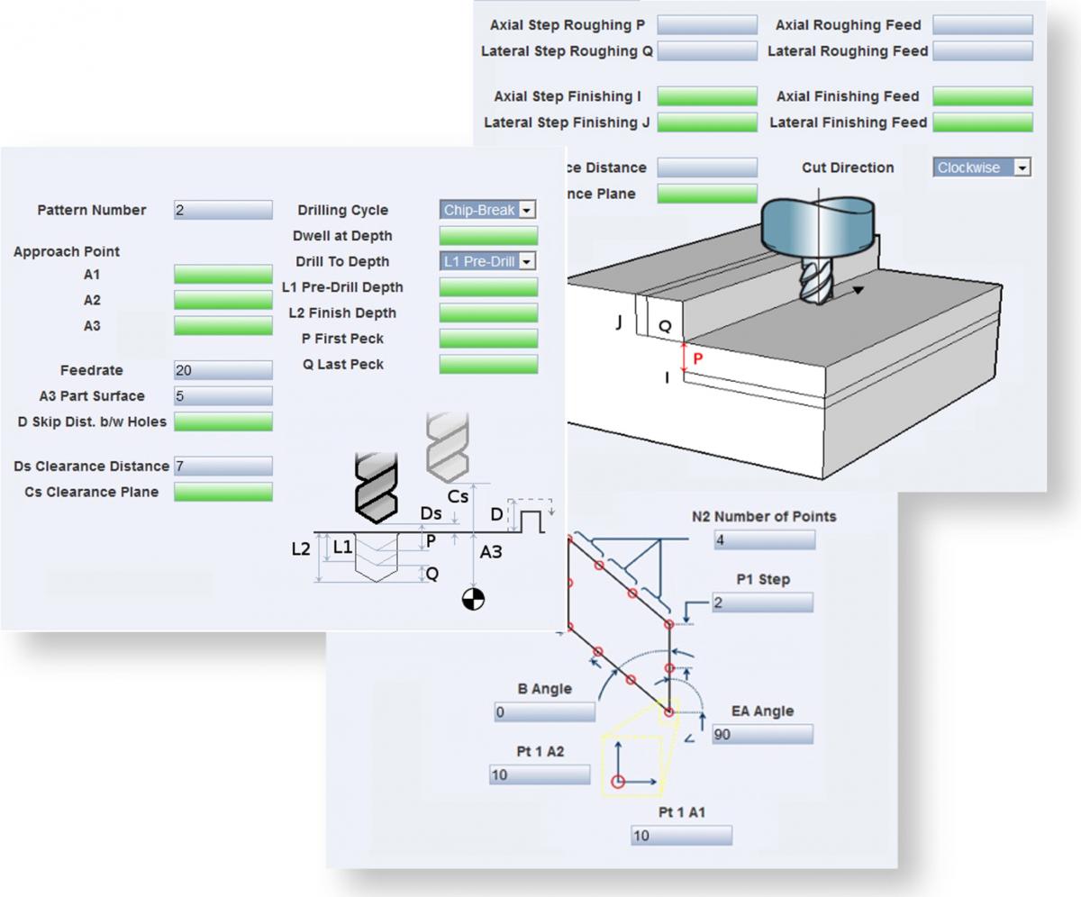 In addition to a large number of canned cycles, the NUMmill software provides functions for material removal of basic pockets; these can be defined as circular, oblong, reticular and square. The hole pattern definitions can use a wide variety of geometries, including Arc, Cover Patter, Drilling with Rotary Axis, Grid, Pitch Circle, Row, and Single Points. Milling operations can be performed on circular, oblong, rectangular and square pockets. The drilling cycles that can be performed on hole patterns include Centre Drill or Chamfer, Peck, Chip, Counter Bore, Tap, Ream-Feed Out, Bore-Dwell/Feed Out, Bore-Stop/Rapid Out, Thread Chase, and Taper Threading.