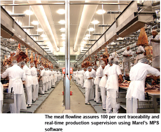 A beef carcass trimming system has delivered inc reased yield and throughput with full traceabilityWITH increasing demands for full traceability along with greater efficiency, meat processor Gilde Norge BA decided to modernise their operations at Throndheim and Egersund in Norway. Whilst the beef processing plant at Gilde Vest Egersund was as efficient as any other that used traditional methods of deboning and trimming, all that changed when traceability became imperative in the meat industry. Their choice was a complete Marel trimming flowlines and traceability systems with continuous flow throughout the process. Two of the most important facets of the new meat flowline are 100 per cent traceability and real-time production supervision using Marel's MPS software. This technology allows total control over production, quality and yield, while plant managers also have a real-time overview of each individual carcass going through the plant, enabling traceability back to the farm on the one hand, and back to each worker on the other. In other words, from incoming raw material to packing and inventory. Operations manager Inge Mykelburst has run the new plant in Egersund from the beginning. "When we decided to install a new trimming system, there were many factors that we needed to consider: increased food safety with traceability was one of the most important ones," says Mr Mykelburst. "The Marel trimming flowline is the core equipment that helped us achieve that goal." Trimming line ensures food safety The trimming flowline is fed with hind- or forequarters that are scanned into the system, and the data is entered into the Marel MPS production control software that runs the process. The product is monitored every step of the way making it possible to trace it back to it's origin. Once a quarter has been deboned, it moves through a Marel registration station on its way to trimming.