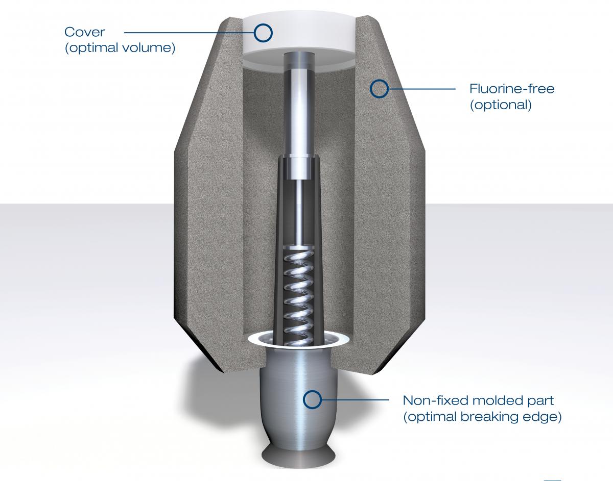 A further benefit is the virtually frictionless sleeve and the integrated riser cap of the EXACTCAST OPTIMA, which prevent crumbling particles from falling into the mold during the compaction process. Riser applications with rigid pins usually destroy the riser during compaction, and crumbling particles from the riser can fall into the mold, which needs to be purged with air afterwards. This can also happen when using spring pins under high compaction pressures. EXACTCAST OPTIMA risers, by contrast, are fitted with a cover of non-friable material preventing mold contamination and related casting defects and thereby raising the cycle times of the molding systems.