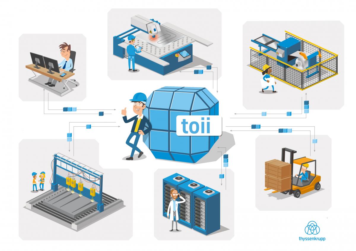 A milestone for the digital transformation: thyssenkrupp connects the machinery of the materials division via a new digital platform. Thanks to toii all machines can communicate with each other. Due to predictive maintenance the platform is also supposed to forecast the necessity of machine services in the future. The name chosen by the business area is a double play on words - it spells IIoT backwards, the abbreviation for “Industrial Internet of Things” - and it is pronounced like the word “toy”, an indication of how the new platform makes linking heterogeneous machines to existing IT structures “child’s play”. toii was developed completely in-house by company software engineering experts and tailored to the specific requirements of Materials Services.