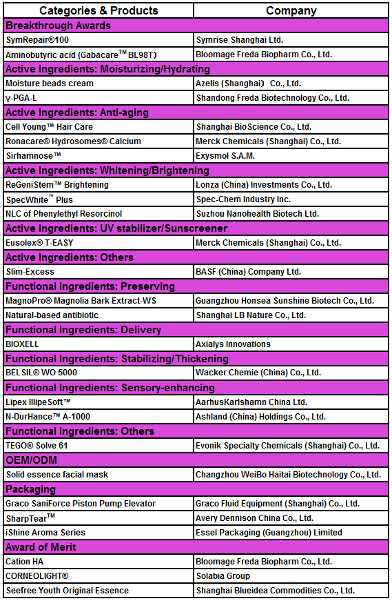 CPCIA 2015, organized by PCHi and Happi China, will also recognize 24 other companies who are influencing the personal care and cosmetics industry in China through their innovative solutions:
