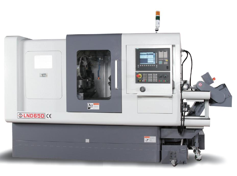 It has up to three sets of X-Z- compound slides available for mounting around the main spindle. It allows 3-4 tools working simultaneously, a powerful CNC turn-mill center. This LND65D is installed with multi-axis Siemens-840D CNC systems, while Fanuc-31i is available upon request.