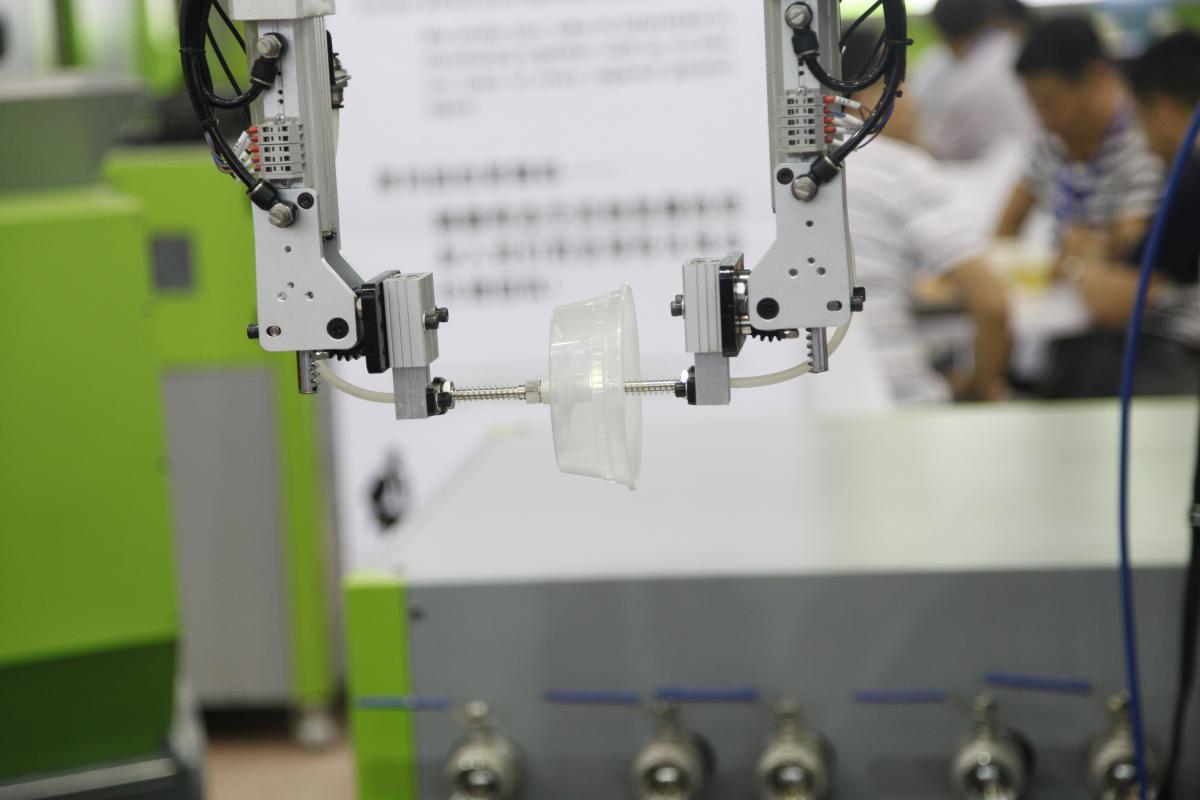 Demag's El-Exis SP 200-67 produces 4 PP food container injection molding (125ml) with a production cycle shorter than 2 seconds. A robotic arm automatically picks up the final product. The 3% to 5% reduction in production cycle time demonstrates the efficiency of the injection molding machine.