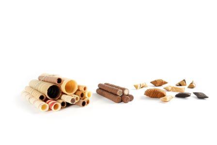 The company's pillow-shaped wafer sticks are closed wafer sticks filled with a sweet or savory filling such as cheese. These can be twisted into a loop, flat pressed, reverse rolled, or filled with aerated chocolate.