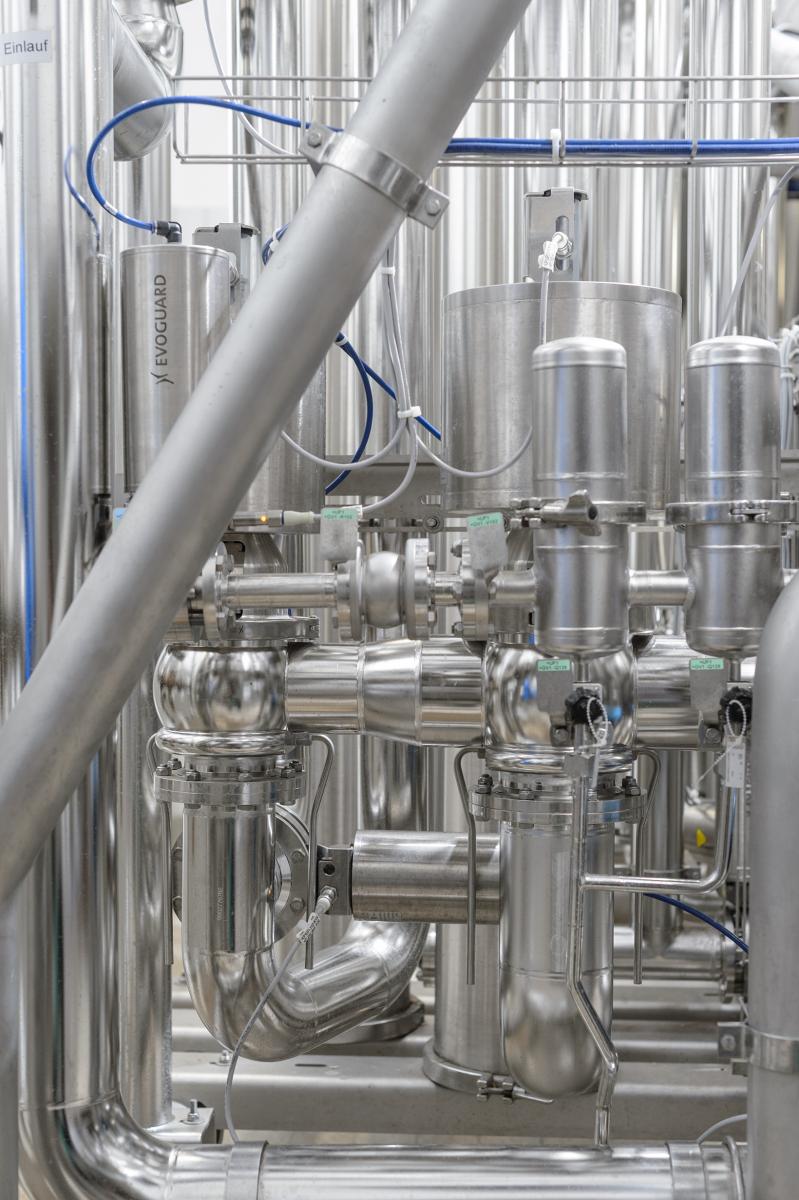 With the in/out method employed here, the mains water flows into the hollow fibres, and the filtered water exits via the hollow fibre’s PES membrane. The outflowing ultra-filtrate is collected in a central pipe inside the membrane module, and discharged. The hollow-fibre elements are cleaned by back-washing with ultra-filtrate in the opposite direction to that of filtration. In this procedure, individual filter elements are switched off while the others keep on producing ultra-filtrate both for back-washing and for continuous supply to the application concerned. Thanks to this separate switching for the filter units, the filter modules can be flushed with ultra-filtrate directly (without intermediate storage in a batch tank), which is supplied straight from the still-operating filter modules, without a back-washing pump being needed. Not only does this avoid any possible contamination of the ultra-filtrate, it also guarantees full production mode while the back-washing routine is running. This in/out concept offers optimum conditions for effective and dependable cleaning of the hollow-fibre membranes. In the CIP process, the chemicals required are dosed into the mains-water flow upstream of the ultra-filtration system, which means they are likewise ultra-filtered before use. If necessary, the system can be fitted with hot-water sanitisation (85 °C), which makes for reliable operation and enables a sanitising routine to be performed without the use of chemicals.