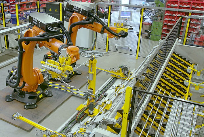 The process involves first inserting a bundle of tubes into a feeder which are then individually orientated by symmetrical rotation according to the positioning of the flanges. Each tube is then picked up by one of the two robots and this transfers it to a moveable spanning device with an appropriate high retaining system designed for longer tubing. The spanning device allows the robots to process the tubes on one or even on two sides in parallel. This also speeds up the procedure; the time required for processing each tube, even at this length, is constantly less than an impressive 3 seconds. Both robots have 7 axes with drive systems and can bend right/left.