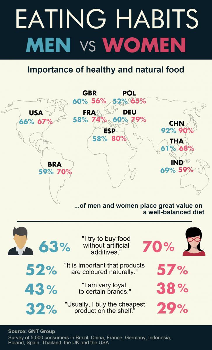The genders show big differences in nutritional habits. In Spain, France or Germany, for example, the rate of females who consider healthy and natural food important is 16 to 22 percent higher than among males. In UK, Indonesia and China, on the contrary, it is the men who top women in their concern for a well-balanced diet. See infographics below: