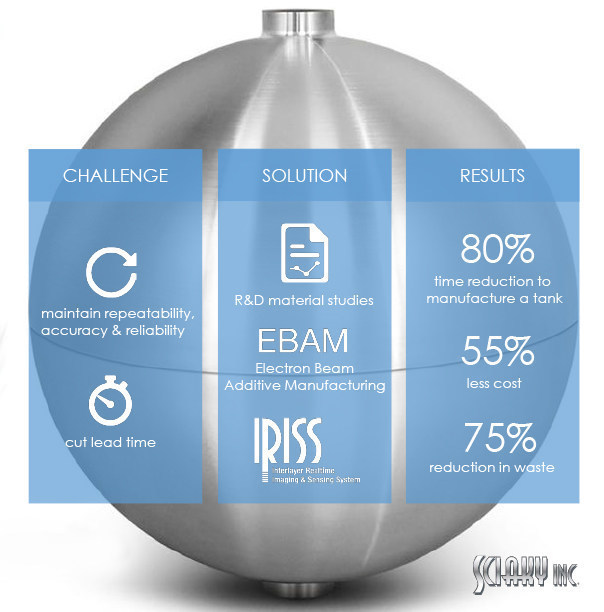 "When our Space Systems business area was looking for ways to reduce costs on our satellite parts, while also maintaining product quality, a company called Sciaky came to us with a solution," said Marilyn A. Hewson, Chairman, President and CEO of Lockheed Martin, while addressing attendees of the Aerospace Industries Association (AIA) Supplier Management Council Summer Meeting on June 14, 2016 in Fort Worth, TX. "We worked together to develop titanium propellant tanks that can be 3-D printed through the use of their electron beam additive manufacturing process. The result was a tank that met our customer's performance standards, with an 80 percent reduction in the amount of time needed to manufacture it, a 75 percent reduction in waste, and a 55 percent reduction in cost."