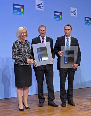 The Federal Minister of Education and Research Johanna Wanka presents the Steel Innovation Award to Michael Kaufmann, technical director Lanico (middle), and Rainer Berkefeld, head of Packaging Development at Schuler Pressen. (Image source: German Steel Federation)