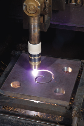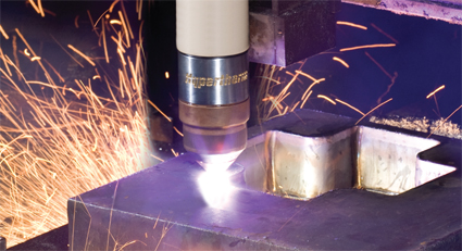 The ability to pierce metal plate is a necessity for many fabricators and steel processing centres. Using plasma, rather than oxyfuel, is most desirable as it means faster piercing times, faster cut speeds, and a cleaner finished product. However, despite plasma's many benefits, some companies find piercing thicker material-say anything over 1 1/4-inch-difficult with plasma. Several factors often left operators with a torch filled with melted consumables, or consumables covered in a quick layer of dross. Today, thanks to recent improvements in plasma torch and consumable design, the piercing capabilities of plasma are significantly better. This article will look at the factors that have traditionally impacted piercing, as well as the technological advancements that are making plasma a worthy choice when it comes to piercing thicker material. Physics of limitations on plasma piercing Sounds good in theory, however as piercing takes place and the hole becomes deeper, three limiting factors begin to impact the process. The first is associated with the energy transfer to the bottom of the hole. This transfer of energy is reduced as the hole becomes deeper and the arc transfers its energy not only to the bottom of the hole but to the sides as well, enlarging the hole near the top of the plate and slowing the rate of pierce progression. As the hole becomes deeper and wider, the distance between the torch and the workpiece lengthens, increasing the arc voltage and the chances of the arc going out. Even if the power supply has enough voltage to maintain the arc, the longer pierce times mean the torch is kept over the hot molten steel for a longer period of time, which begins to melt the consumables, particularly the shield. The second limiting factor is associated with the fluid dynamics of removing the molten material from the hole. Cold plasma gas and shield gas are supposed to blow the molten slag out of the hole and away from the pierce. However, as the hole becomes deeper, this becomes more difficult. As a result, gas flow tends to puddle at the bottom. The third and most impactful factor limiting piercing of thick metals is the effect of the molten material coming out of the pierce hole. Much of it winds up on the end of the torch. As the torch sits directly over the metal being pierced, heat and molten metal travel back to the torch. As the temperature of the torch-particularly the shield-increases, molten material more readily adheres to it.This transfers even greater levels of heat into the shield, creating a continuously increasing condition of slag adhesion and heat build-up. This progressive build-up of slag can block vent holes, block the main orifice and affect the torch's initial height sensing; all of which negatively impact pierce capability and cut quality. Eventually, the shield and even the nozzle can melt. Another problem: any molten metal that doesn't wind up on the torch, often winds up on top of the plate. This significant puddle, which usually forms on the top surface of the plate around the edge of the pierce hole, can cover a large area of the plate and be quite thick. If the torch runs through this slag after it has begun to solidify, damage will occur to the tip of the torch (usually the shield). Using a torch lifter with voltage control provides the ability to raise the torch over this puddle and prevent physical contact, but the action of raising the torch during the cut can cause striations in the cut edge as it passes through the slag puddle. The best way around this problem is to provide a sufficiently long lead-in to the cut, preventing the torch path from crossing the slag puddle. As a general rule of thumb, a lead in equal to the material thickness being cut is usually recommended.